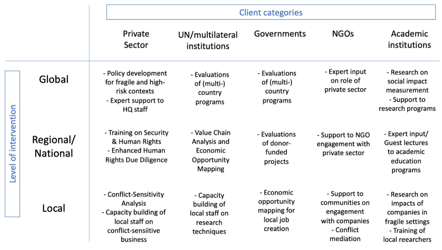 • Support to UN institutions, development finance institutions, investors, governments and NGOs on how to better engage with the private sector in fragile settings and high-risk settings;